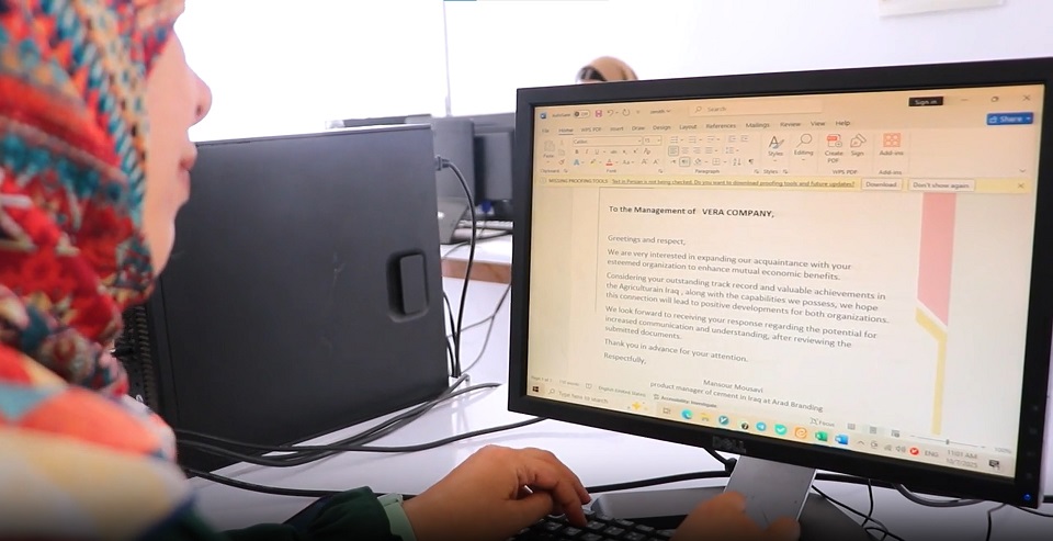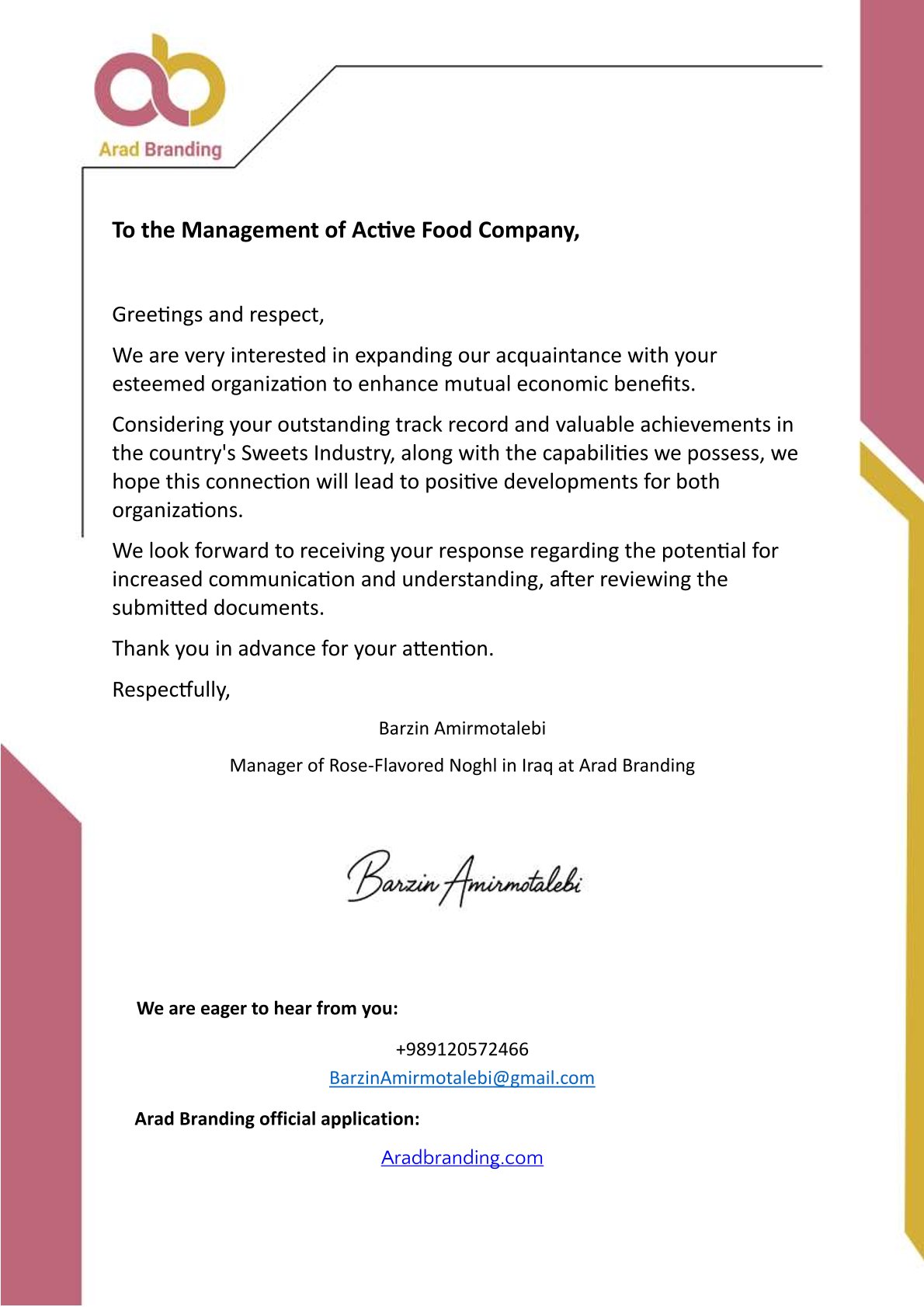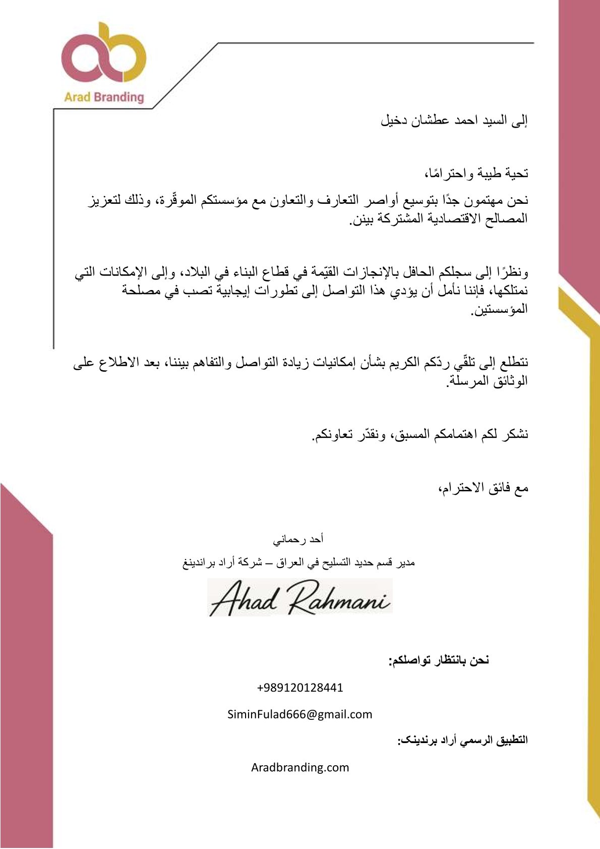 برای مثال ارتباط تاجر آرادی بواسطه نامه زیر به مخاطب این حس را منتقل می کند که تمامی تجارت های آراد برندینگ در عراق برای نقل و شیرینی جات توسط این شخص انجام می گیرد.