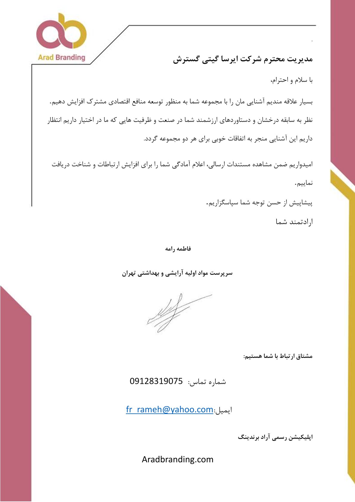 در ادامه با استفاده از سربرگ رسمی آراد برندینگ، نامه هایی در زبانهای مختلفی که نیاز دارید برای شما تدارک دیده می شود.