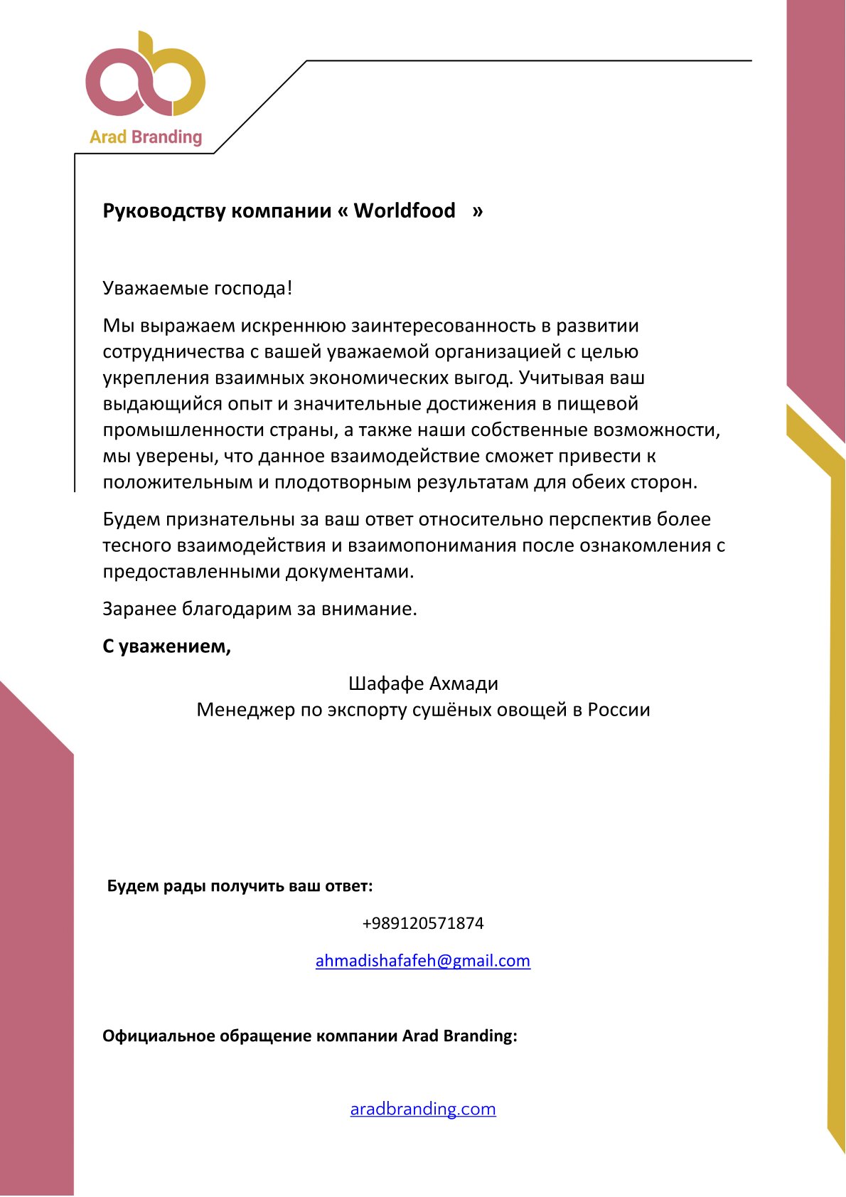 برای مثال نامه زیر با زبان روسی و سربرگ رسمی آراد برندینگ، توانسته یک معارفه حرفه ای در قالب تامین کننده بزرگ حوزه سبزیجات خشک برای شرکت هدف ایجاد نماید.