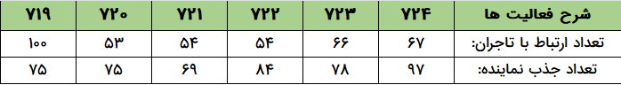 - تعداد ۲۲۸ نماینده با راهنمایی های واحد منتورینگ آموزش دیده و وارد چرخه ارتباط با تاجران شدند.