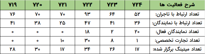 - تعداد ۱۵۳۲ میتینگ با حضور منتورهای صادراتی برای تاجران و نمایندگان آرادی برگزار گردید.
